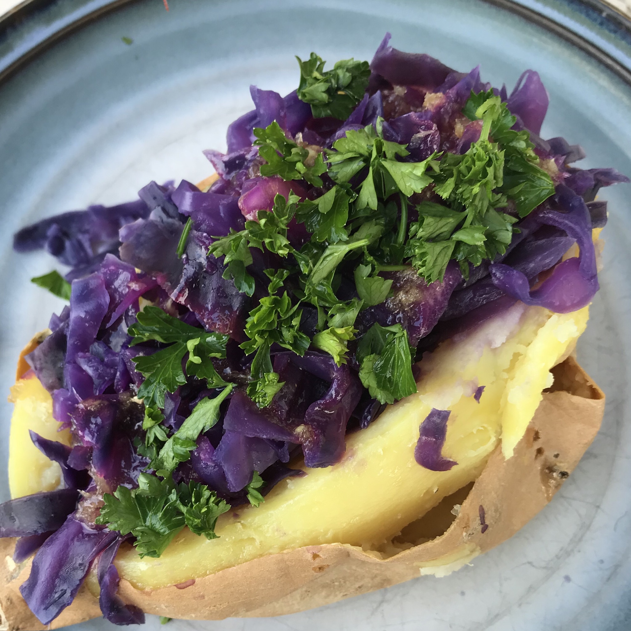 - Split open sweet potatoes and mash each side slightly with a fork. Stuff as much cabbage into the opening.