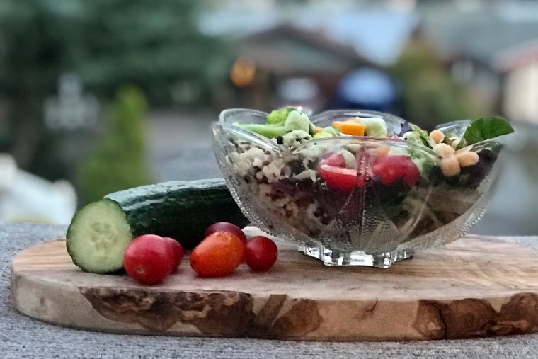 4. When the wild rice and squash are finished, assemble in bowls with a base of spring greens. Top with garbanzo beans, broccoli, cherry tomatoes, cucumbers and a few red onions.