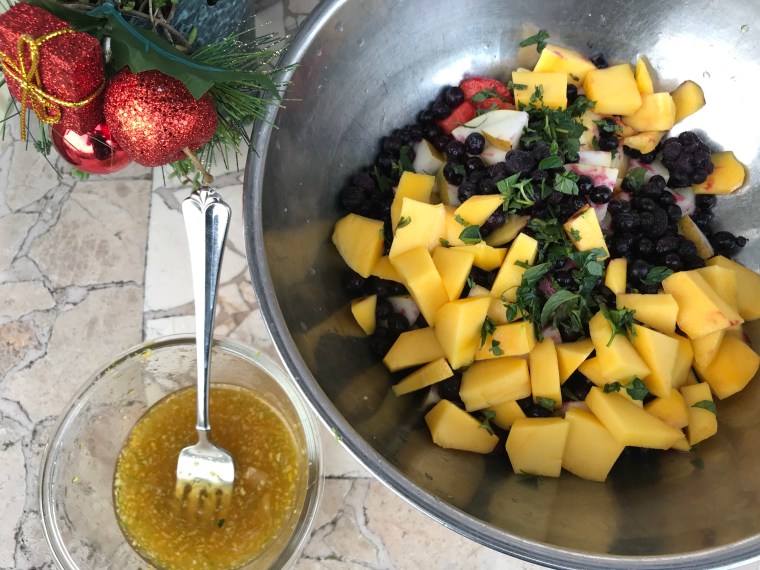 - Pour the dressing over the fruit and sprinkle with chopped mint. Serve immediately.