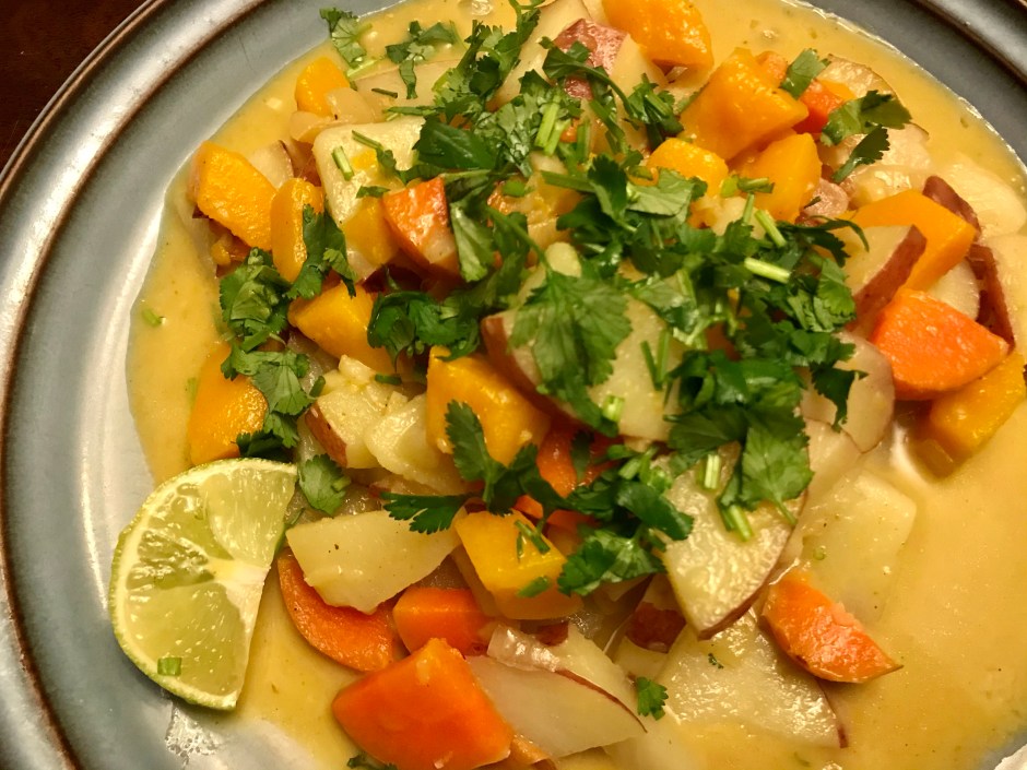 Curry, ginger, and garlic simmered in coconut milk: if you haven’t yet tried this amazing combination of flavors, you’re missing out! Served with steamed potatoes, carrots, and squash this recipe makes for quite the satisfying, delicious, and healthy meal.