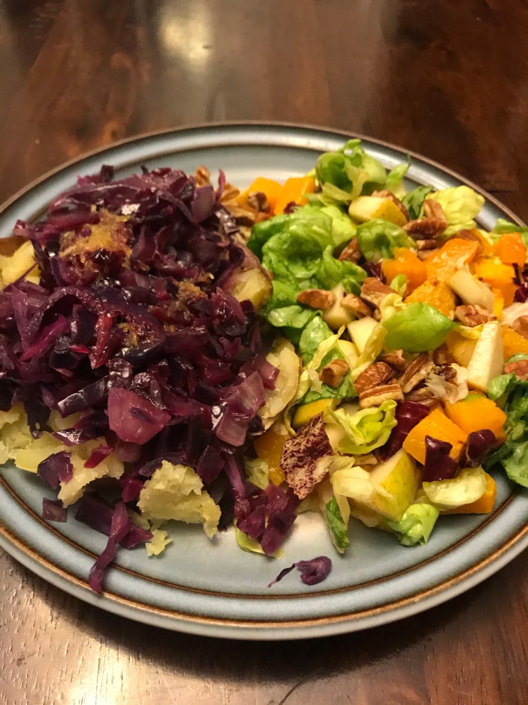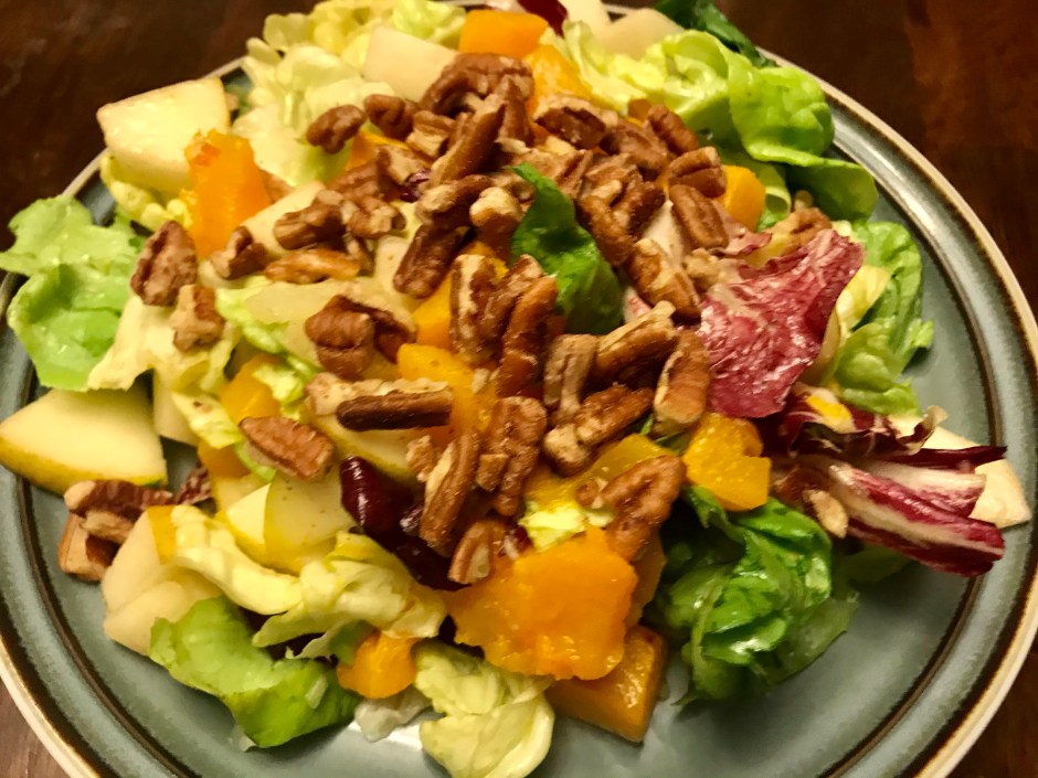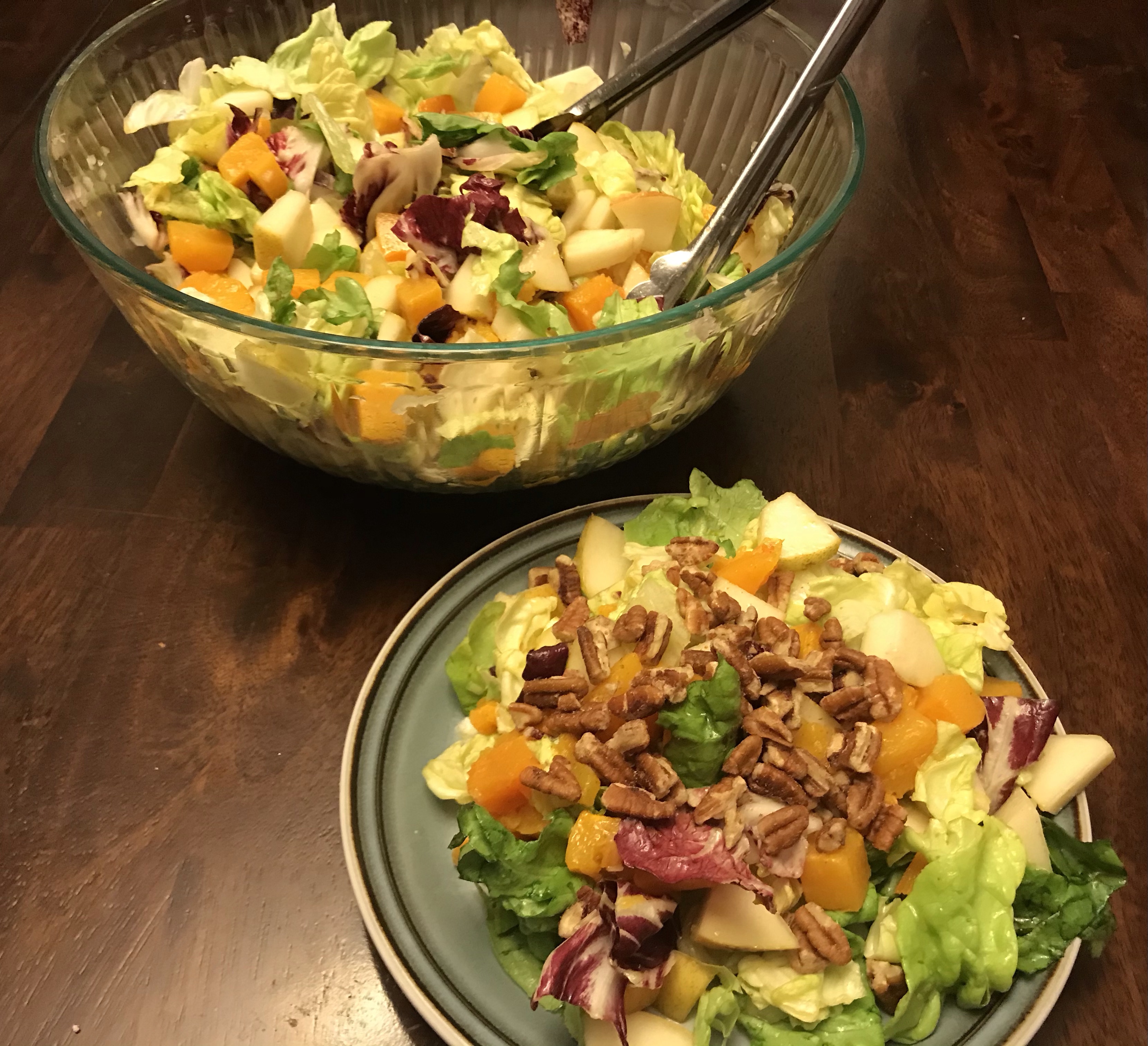 This salad is a welcome addition to my weekly healthy meal plan. Butter leaf lettuce is my favorite green leafy vegetable and compliments radicchio well. The butternut squash makes this a hearty salad, and the pears are refreshing and sweet. The dressing is fresh orange juice, honey and mustard; it’s amazing. I’m excited for you to try Butternut Squash & Pear Salad with Pecans.