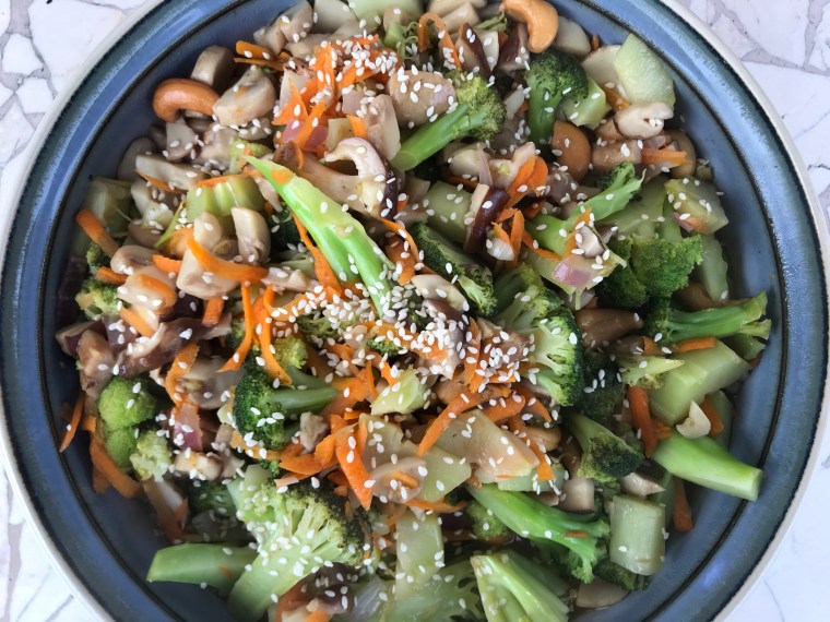 - Add in shredded carrots, cashews and sauce. Stir well and simmer for about 2 minutes. Sprinkle with sesame seeds. Serve alone or on top of quinoa, brown rice or gluten-free noodles.