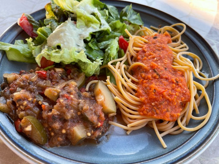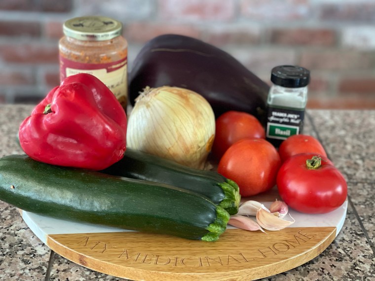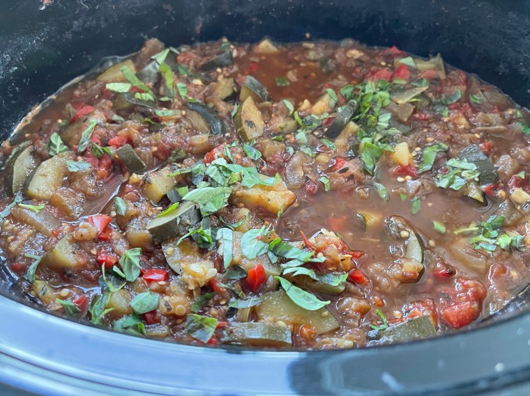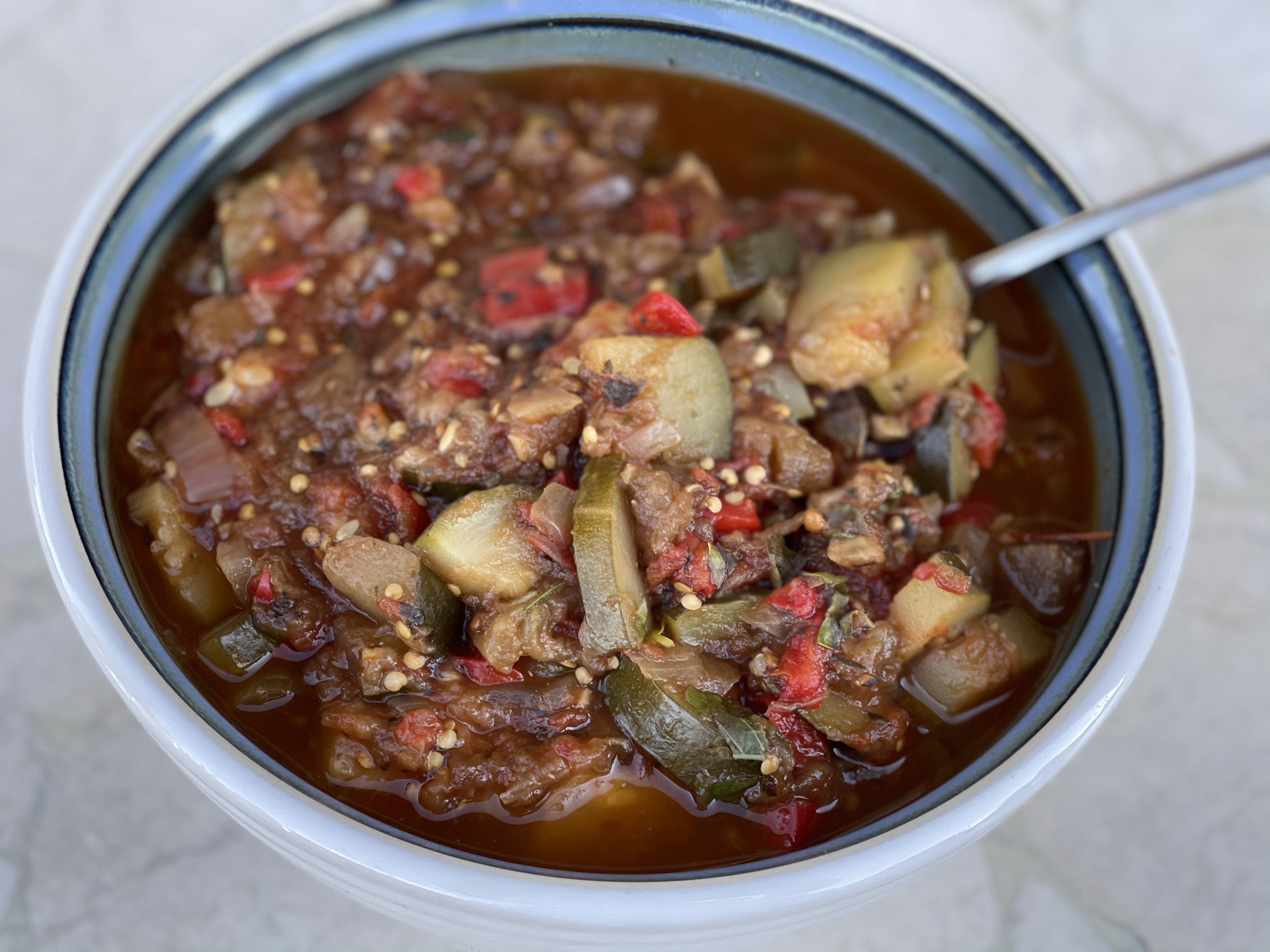 Slow cook these delicious later summer vegetables together for an easy healthy meal. This French stew recipe of eggplant, summer squash, tomatoes and herbs has about 20 minutes of prep time. The vegetables simmer for about 5 hours making delicious ratatouille for dinner.